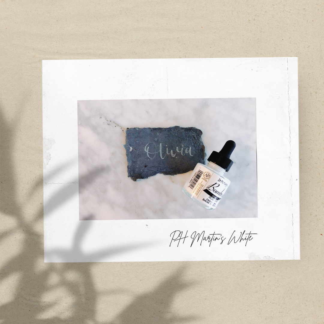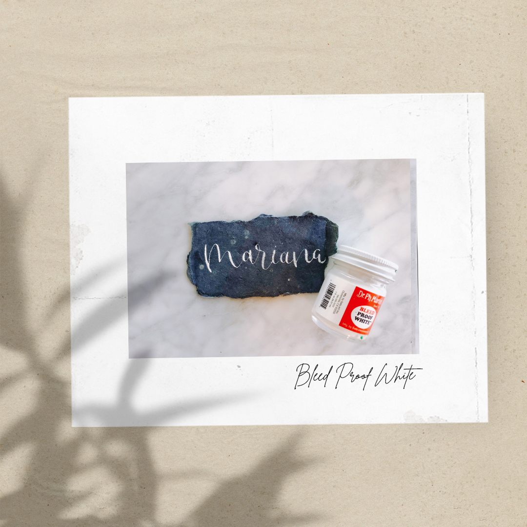 Una de las tendencias actuales más populares en el mundo de la caligrafía es el uso de la tinta blanca. Le da un toque moderno y ligero a tus proyectos, además es ideal para papeles oscuros como el negro o azul marino. Como ya hemos visto en los blogs pasados, el mercado nos invade con miles de opciones. Obviamente, algunas tintas son mejores que otras, incluso hay tintas que no recomendaría para nada. Esta semana decidí aprovechar un proyecto de place tags para una boda, y comparar varias tintas blancas.
