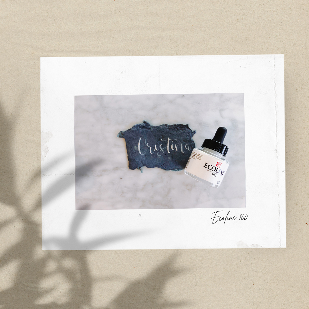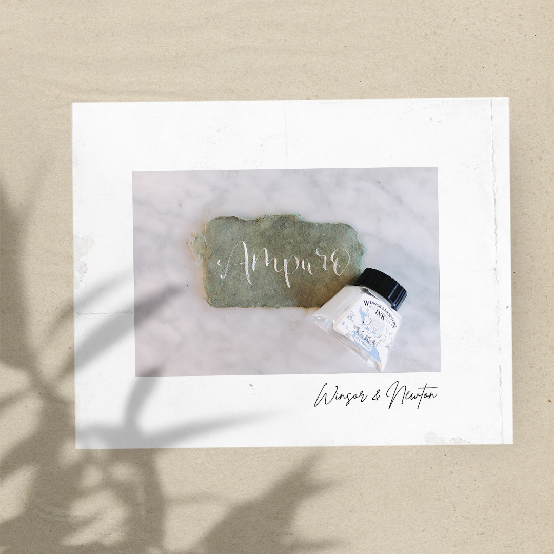 3 Winsor & Newton 974 – Se podría decir que esta tinta inglesa también compite por los primeros lugares de la tinta blanca para caligrafía. Su consistencia es ideal, ¿entonces… ¿Por qué está en tercer lugar? La respuesta a esta pregunta está en la pigmentación en relación con los trazos ascendentes. La tinta no cuenta con una pigmentación lo suficientemente saturada. Cuando llevamos la plumilla de abajo hacia arriba, la tinta no se marca y constantemente me ví en la necesidad de repasar estas líneas.