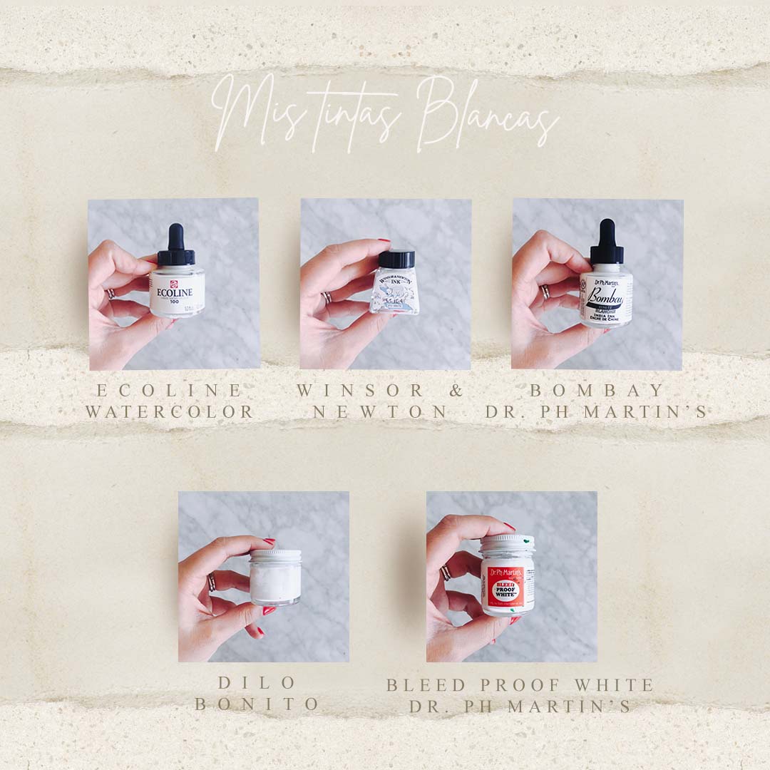 Sobre un papel azul, hecho de manera artesanal por las increíbles manos del equipo de Farmette, comparé 5 distintas tintas blancas. Aquí podrán ver el resultado de mejor a peor, links de compras, así como mi opinión en general en relación con la consistencia, textura, opacidad y pigmentación.